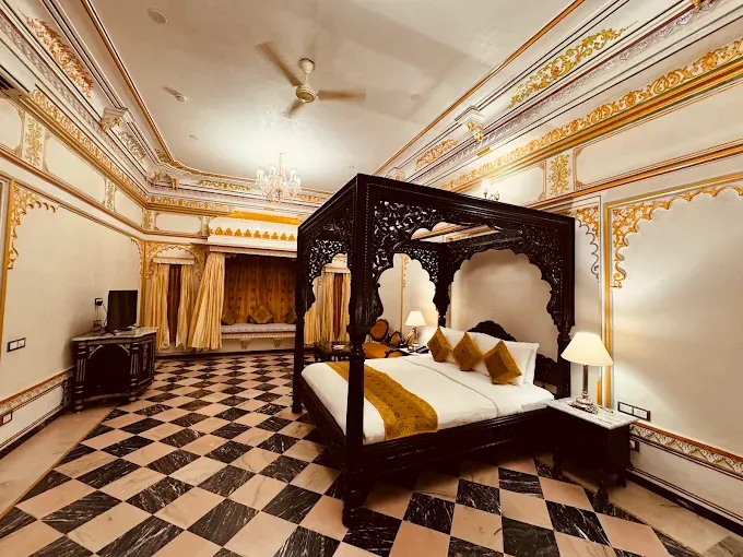 A magnificent palace hotel adorned with intricate Rajasthani craftsmanship, offering guests an immersive experience of royal grandeur.