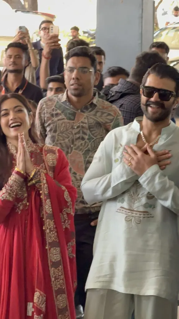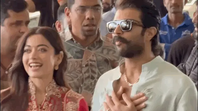 वहीं विजय देवरकोंडा ने धोती और कंधे पर सिंदूरी लाल रंग का दुपट्टा पहना। दोनों अपने पारंपरिक परिधान में खूबसूरत लग रहे थे। परिवार ने नजर से बचाने के लिए दोनों के चेहरे पर काला टीका लगाया था।