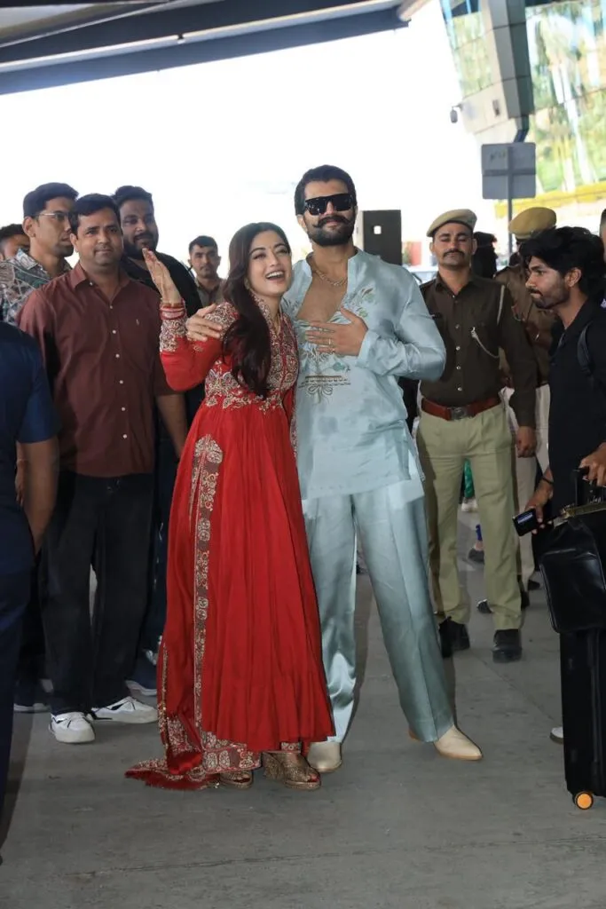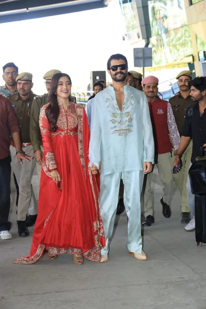 उदयपुर में अपनी शादी के बाद साउथ स्टार रश्मिका मंदाना और विजय देवरकोंडा शुक्रवार दोपहर हैदराबाद रवाना हो गए। रश्मिका रेड कलर का सूट पहनकर पति विजय का हाथ थामकर एयरपोर्ट पर पहुंचीं।