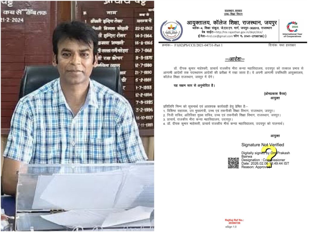 उदयपुर के एमजी कॉलेज में 3 दिन पहले एबीवीपी कार्यकर्ताओं के हंगामे और प्रिसिंपल द्वारा की गई कमेंटबाजी के मामले में उच्च शिक्षा विभाग ने एक्शन लिया है। कॉलेज शिक्षा आयुक्तालय के आयुक्त ओपी बैरवा ने आदेश कर प्रिसिंपल दीपक माहेश्वरी को एपीओ कर मुख्यालय में उपस्थिति देने को कहा है। हंगामे के दौरान प्रिंसिपल माहेश्वरी और छात्राओं के बीच आमने-सामने खूब बहस हुई थी।